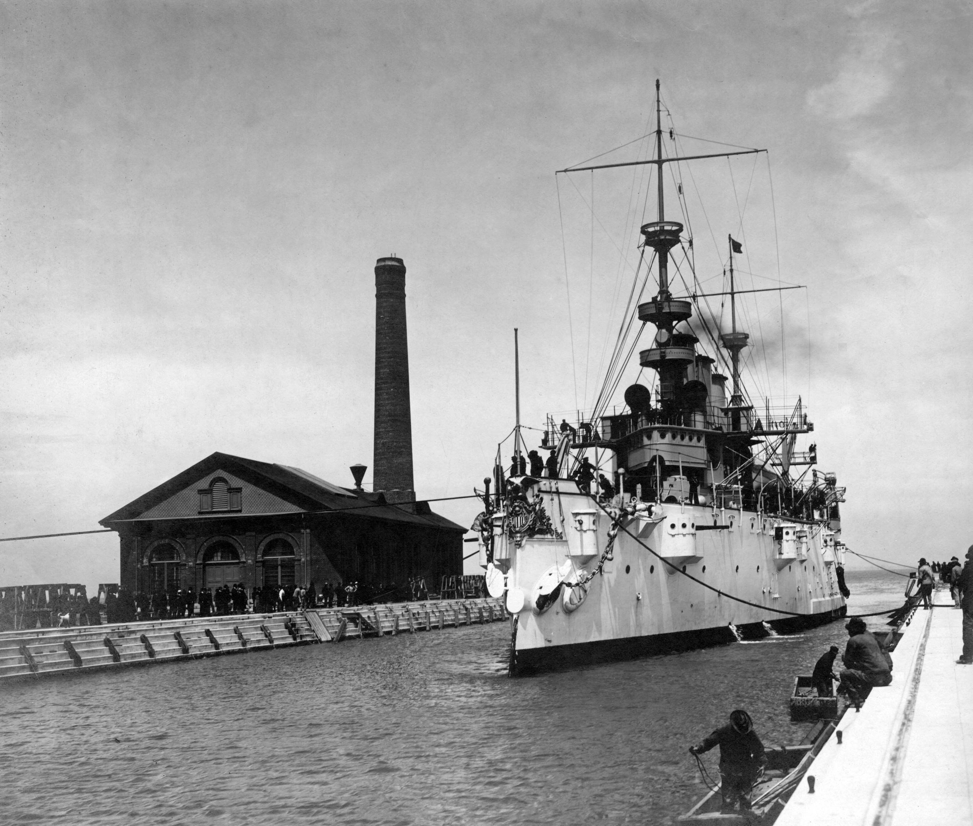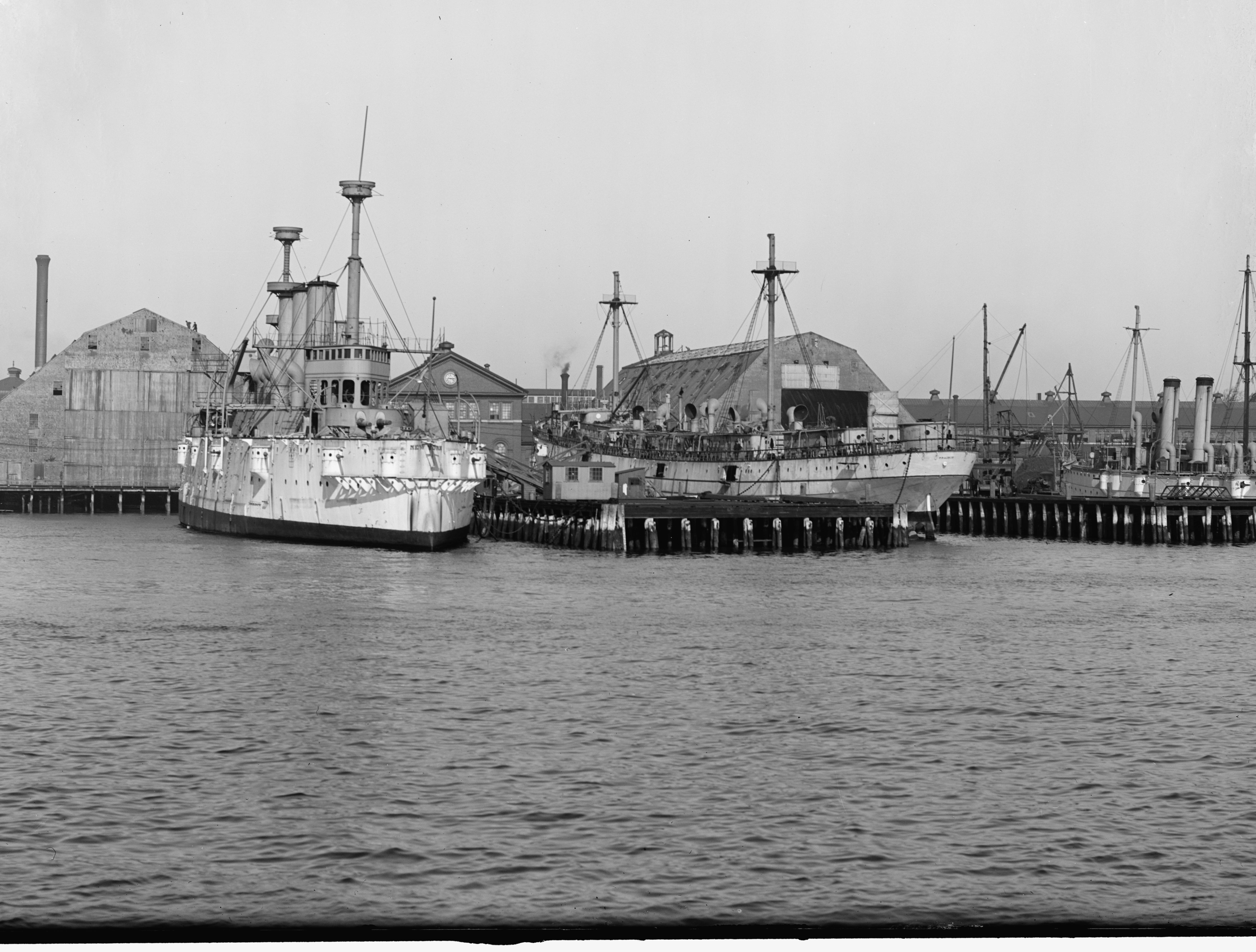 2.61k | Charlestown Navy Yard from the water, Boston, Mass. Photo shows on the left the cruiser New York (ACR-2) decommissioned 31 March 1905 for modernization. On the right is the Prairie, an auxiliary cruiser originally the Morgan liner El Sol. She was in and out of Boston 1901-1906. (Source: C. Seavey, 2016) | Photographer Edward H. Hart, courtesy of the Detroit Publishing Company, Digital Id det 4a17859 loc.gov |