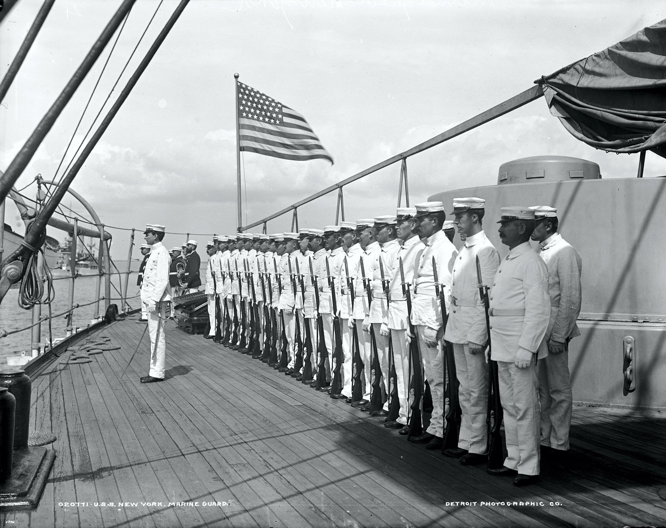 739k | The Marine Guard stands at attention aboard the cruiser New York (ACR-2) circa 1899. Image #LC-D4-20771 courtesy of the Library of Congress |