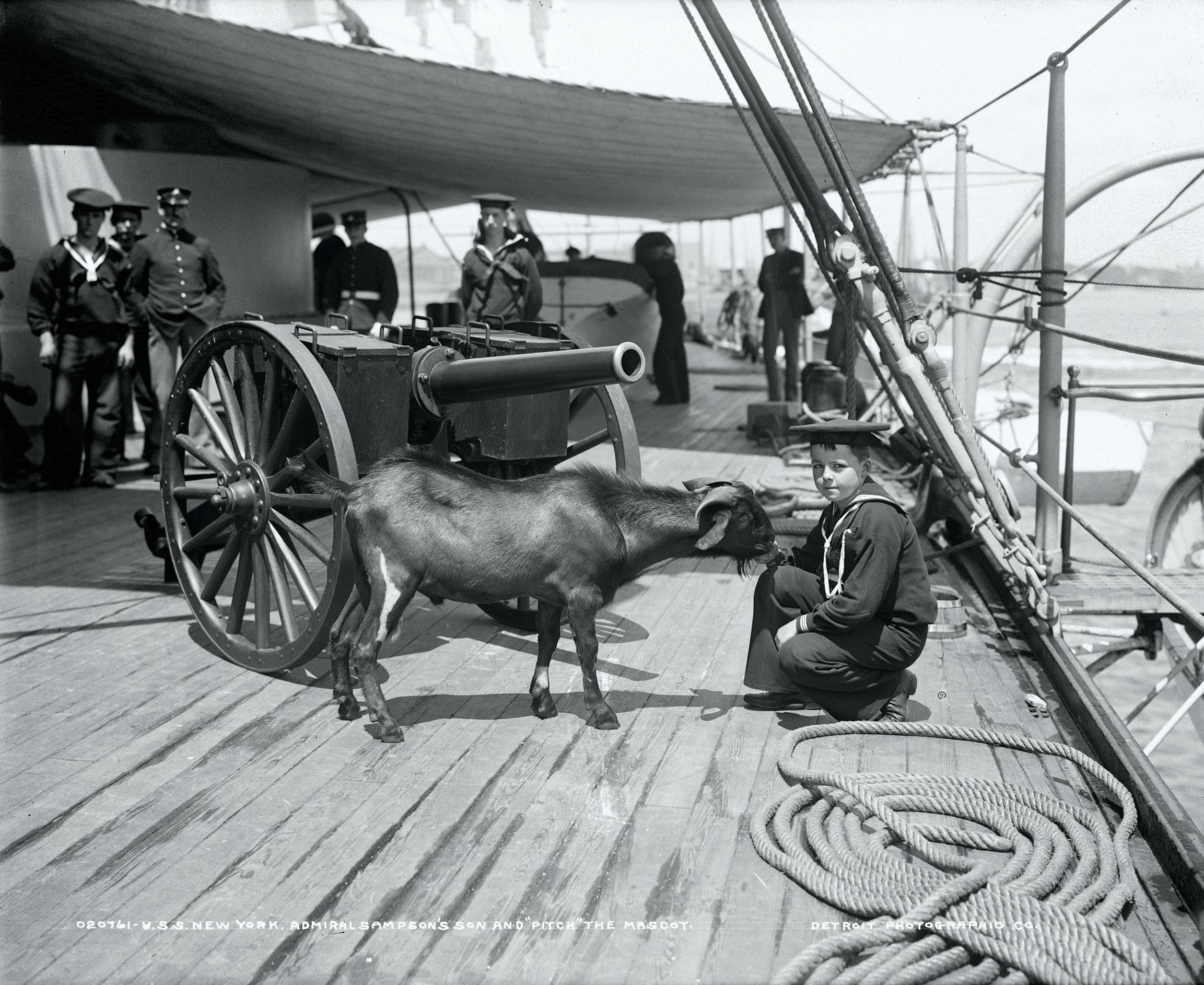 900k | New York (ACR-2), Admiral William Thomas Sampson's son and "Pitch" the ship's mascot 1899. Image # LC-D4-20761 courtesy of the Library of Congress |