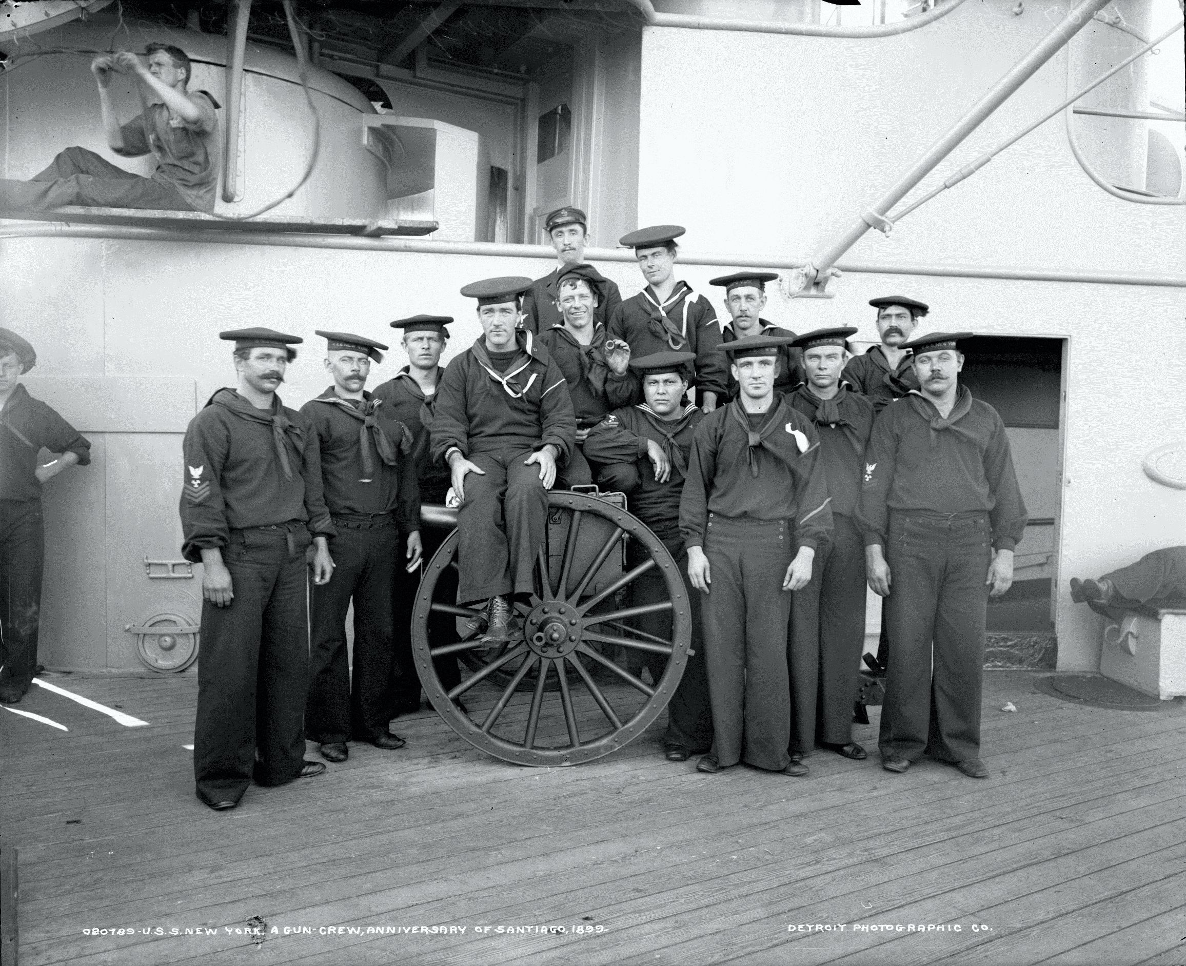 955k | New York (ACR-2), a Navy gun crew, poses for an anniversary of Santiago, Cuba 1899. Image #LC-DIG-det-4a14571 courtesy of the Library of Congress |