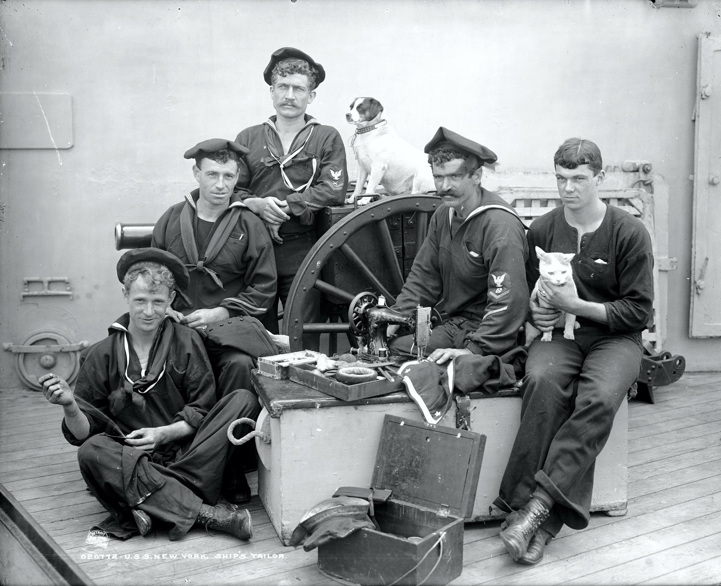 676k | The cruiser New York (ACR-2) ship's tailor takes time out from his duties to pose for a picture with his shipmates circa 1890's. Image #LC-DIG-det-4a14554 courtesy of the Library of Congress |