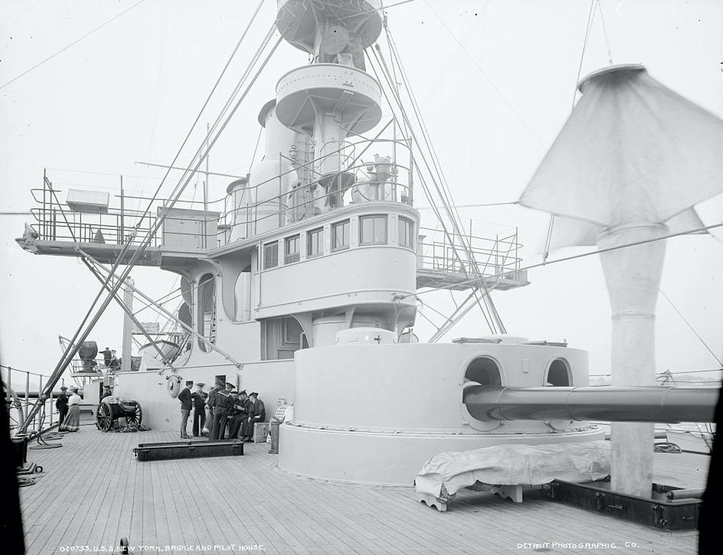 204k | Close up of the narrow and exposed bridge and pilot house of the New York (ACR-2) on 5 July 1899. Library of Congress, Photo #LC-D4-20733 |