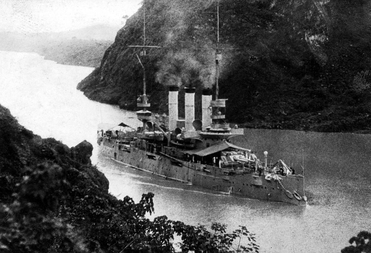 268k | Rochester (CA 2) passing through the Gaillard Cut in Panama circa 1925. From the William C. Davidson Collection. Naval History and Heritage Command, Photo #UA 557.06.01 |