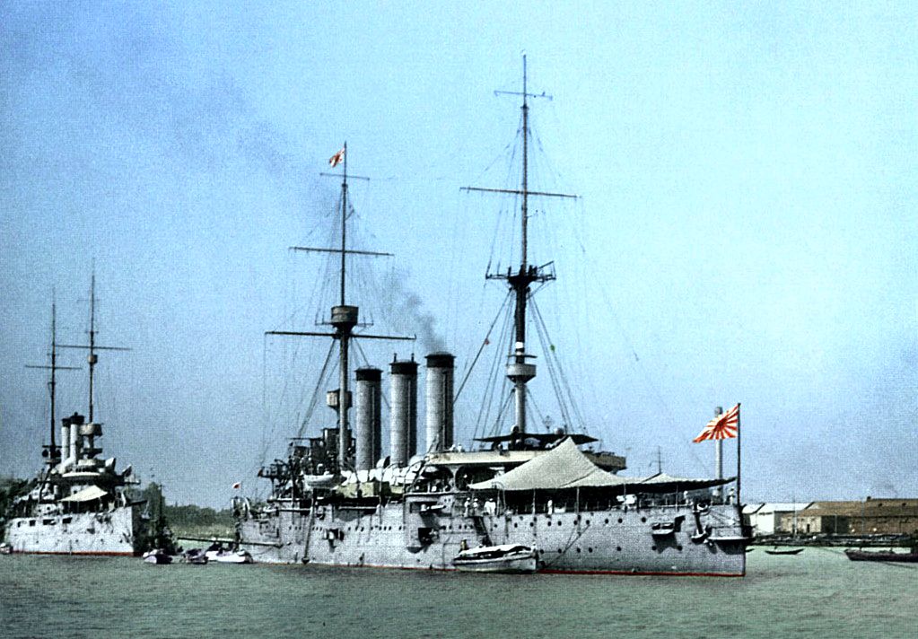 160k | Imperial Japanese Navy armored cruiser HIJMS Izumo at anchor in the Huangpu River, Shanghai, 1932. The armored cruiser Rochester (CA 2) is anchored to the left. Photographer unknown. | Robert Hurst |