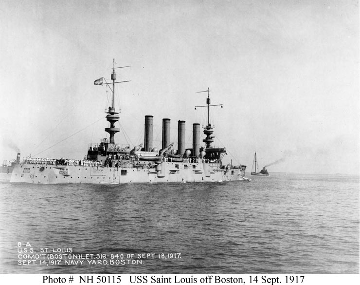 USS Saint Louis (Cruiser No. 20) Photographed circa 1906-07, soon after completion. U.S. Naval Historical Center Photograph #NH 44192. |