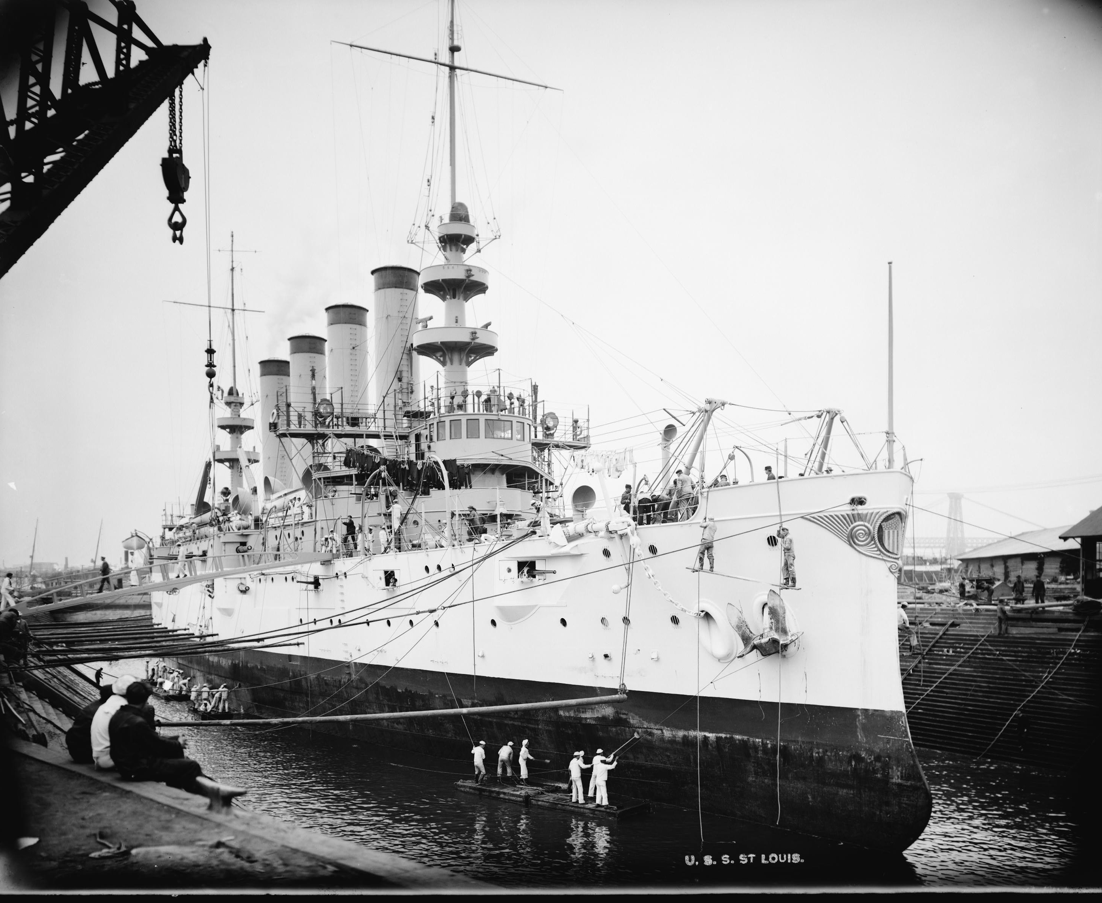 2.68k | USS St. Louis (Cruiser No. 20) docking, Brooklyn Navy Yard. | Photographer: Western Newspaper Union. National Archives Identifier: 6880364 Local Identifier: F1032 Photo courtesy of National Archives |