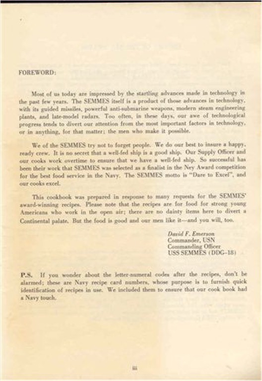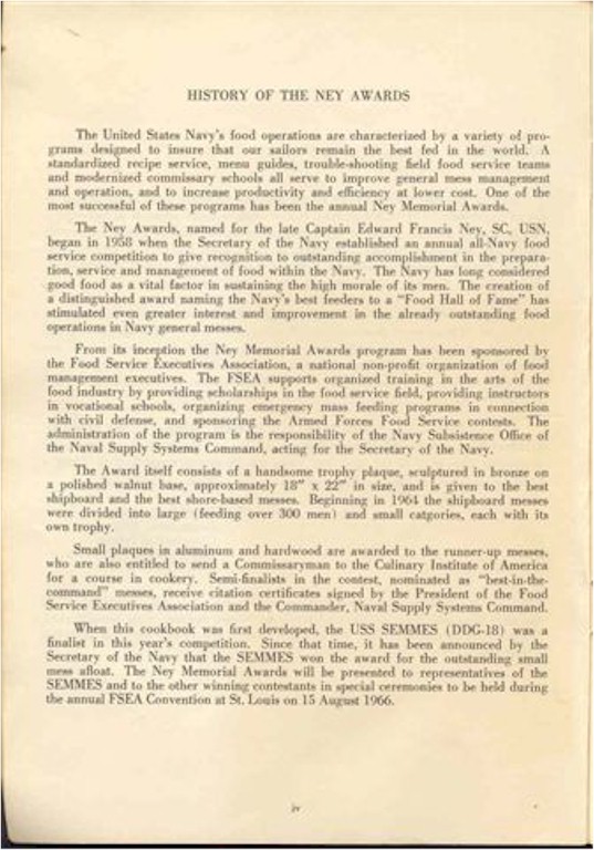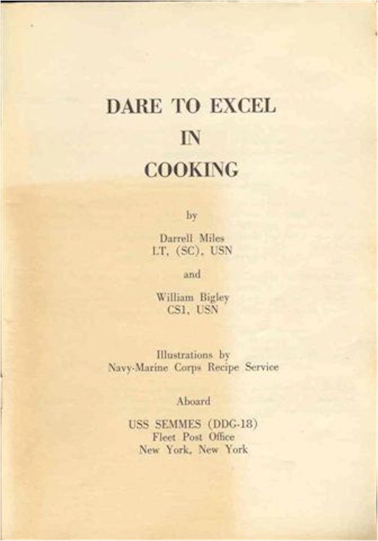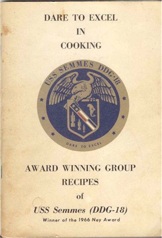 In 1966 the USS Semmes (DDG-18) won the NEY AWARD for proficiency in the operation of their Commissary Department. A Cook Book was written by their food service staff and printed aboard the USS Tidewater. It is presented here in hopes that you will see recipes that bring back fond, or maybe not, memories of those many meals aboard US Navy ships.