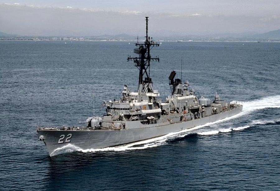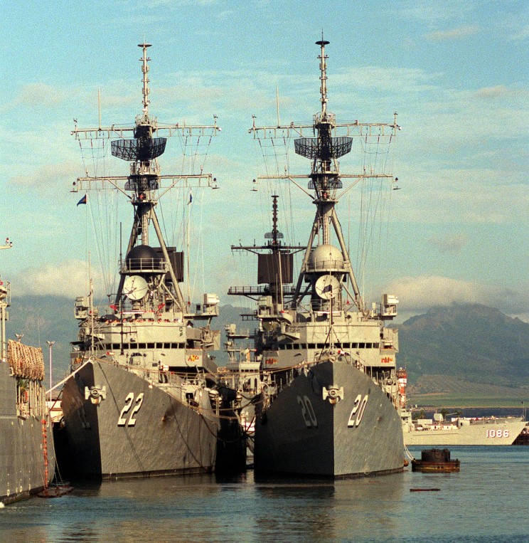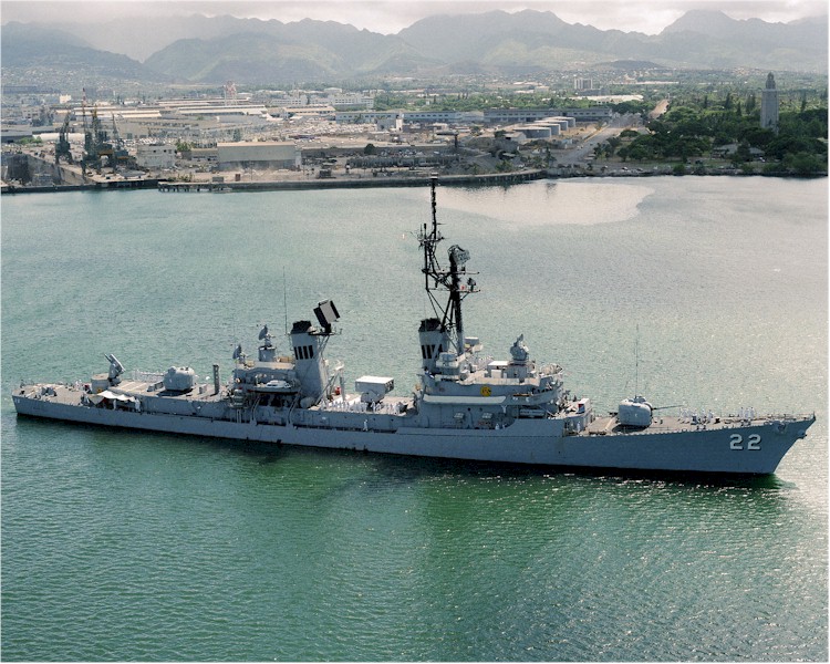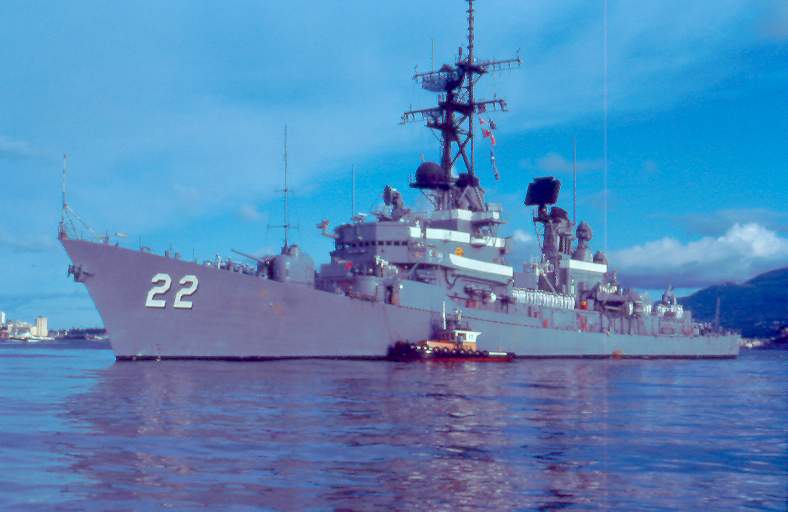 | 191k | Note SPQ-9 surface seach radar installed in early-mid 1980's upgrade of DDG-19, 20 & 22. Also note SLQ-32 boxes present on O-4 level slightly forward and abeam the main mast. Ship appears to be operating with USS Goldsborough (DDG-20) (identifiable by SPQ-9 radar) also homeported in Pearl Harbor, HI with Benjamin Stoddert. (Description provided by Chet Makuch) | - |
