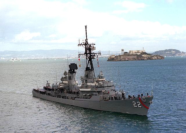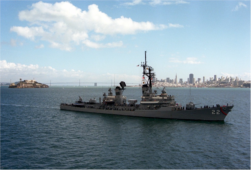 | 177k | DN-SC-84-01908. San Francisco, October 29 1981, a starboard beam view of the guided-missile destroyer USS Benjamin Stoddert (DDG 22), with sailors manning the rail during Fleet Week activities. Visible in the background are Alcatraz Island, the San Francisco-Oakland Bay Bridge, and the San Francisco skyline. U.S. Navy photo by PH3 Curt Fargo. | Robert M. Cieri |