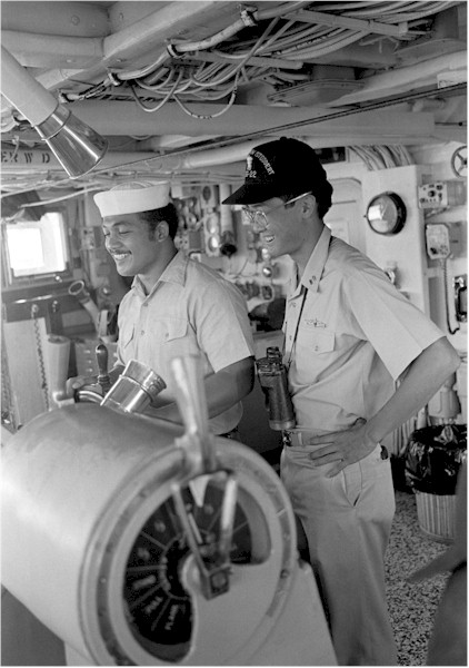 | 71k | DN-SN-83-01950. Lieutenant Daniel W. Chang, who is stationed aboard the guided missile destroyer USS BENJAMIN STODDERT (DDG 22), talks to one of the crewmen as they stand at the ship's controls on the bridge, November 1 1982. | Bill Gonyo |