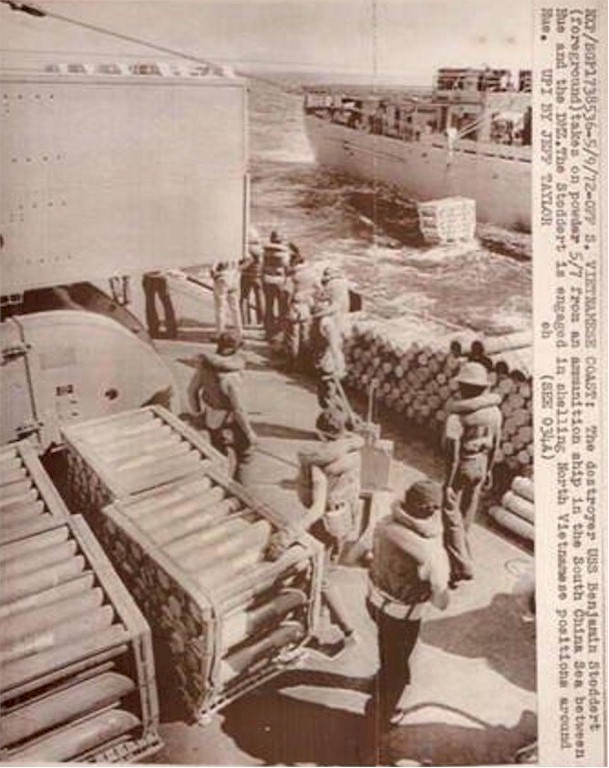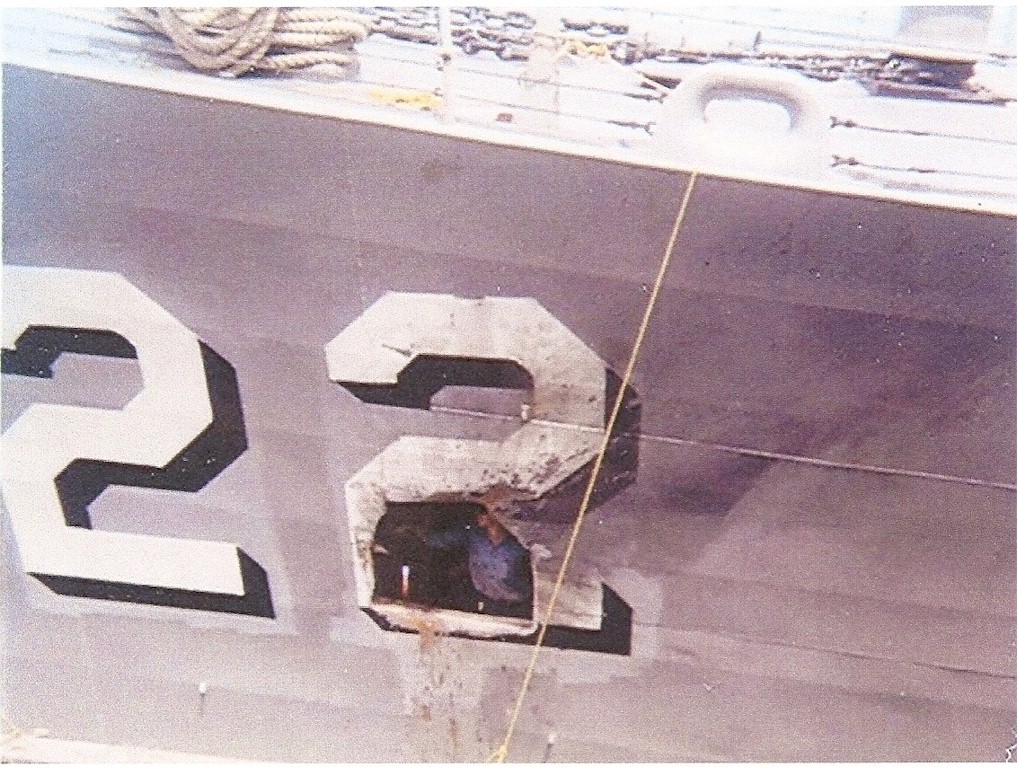| 294k | In 1971 the Stoddert was providing gun support off the coast of Vietnam. It was 12 miles out and received gun fire, a 6” round exploded outside the hull on the 3rd shot. It punched through the hole on the hull number 22, destroying the forward Medical Locker. | Tommy Trampp/HMC Robert R. Lusk Jr |