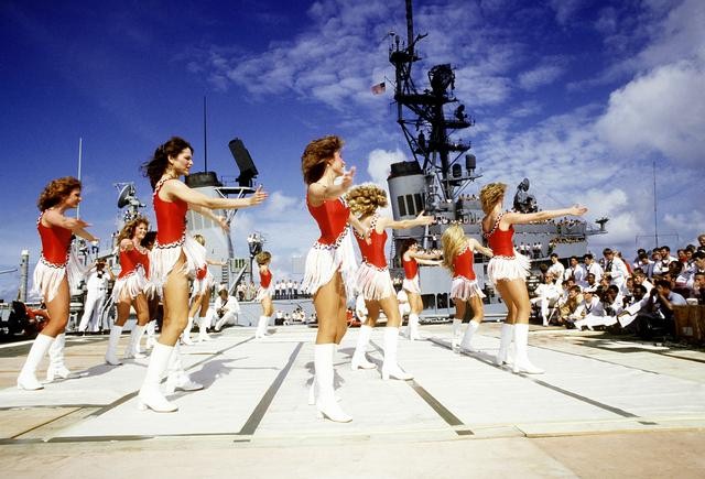 | 80k | Jan. 1.1983, Indian Ocean, the Dallas Cowboy Cheerleaders perform their USO show "America and Her Music" on the deck of the nuclear-powered guided missile cruiser USS Bainbridge (CGN-25). Crew members of the guided missile destroyer USS Waddell (DDG-24) watch from their ship. | Fred Weiss |