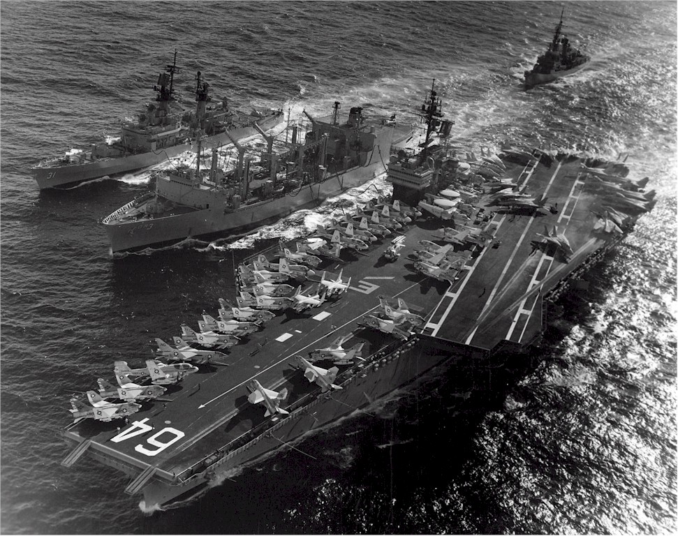 | 293k | Circa 1977,the USS Kansas City (AOR-3) simultaneously refuels the USS Constellation (CV-64) and USS Sterrett (CG-31), while the USS Waddell (DDG-24) follows astern. US Navy and Marine Corps Museum/Naval Aviation Museum, Photo No. 1996.488.103.085. | Mike Green |