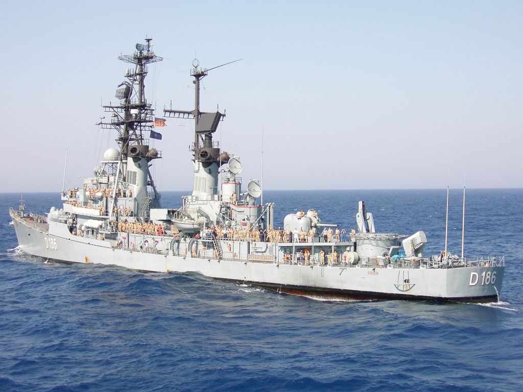 | 89k | German DDG Mölders (D-186) during a NATO's STANAVFORMED port call to Barcelona, Spain, on May 4, 2002. Shown in this image, left to right, are the two "dishes" of the SPG-51 missile guidance radars, the aft 5"/54 gun mount, the single-arm Mk.13 missile launcher, the aft RAM launcher, and the winches and "fishes" of the SLQ-25 Nixie anti-torpedo decoy. The Greek frigate Limnos (F-451) is outboard of Mölders. | Fabio Peña |