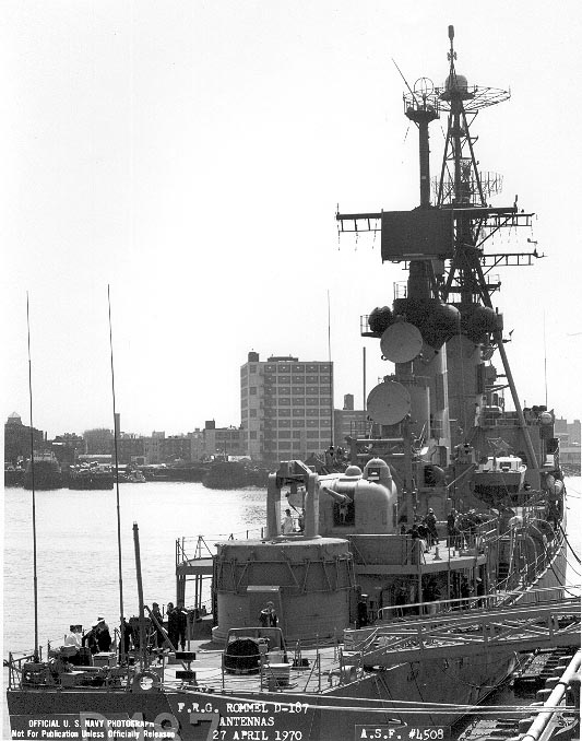 92k | Three views showing antenna arrangement of FGNS Rommel (D-187/DDG-30) taken on 27 April 1970 at Boston Naval Shipyard prior to transfer to German Navy. Boston Naval Shipyard photographs ASF #4507, 4508, 4510, Boston National Historical Park Collection, NPS Cat. No. BOSTS-14116. | Stephen P. Carlson, Boston NHP, Charlestown Navy Yard |