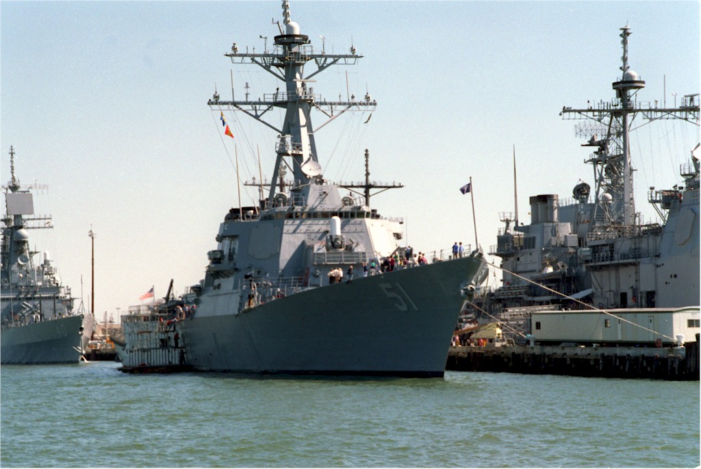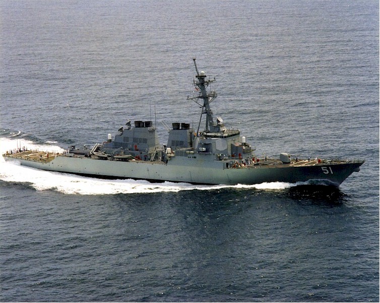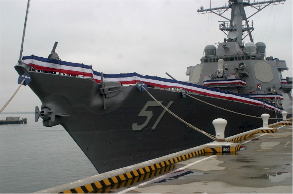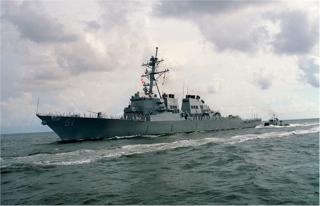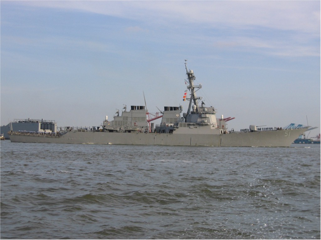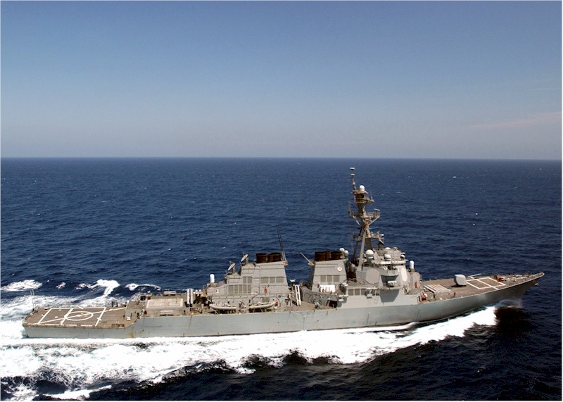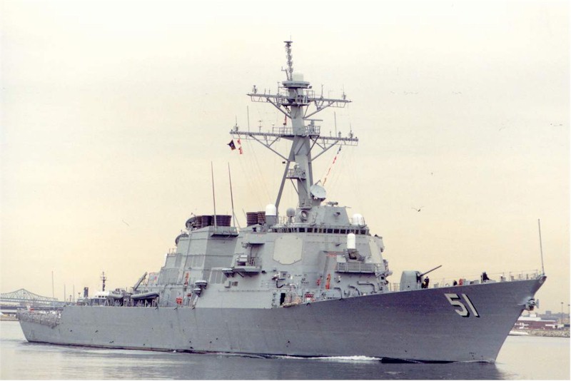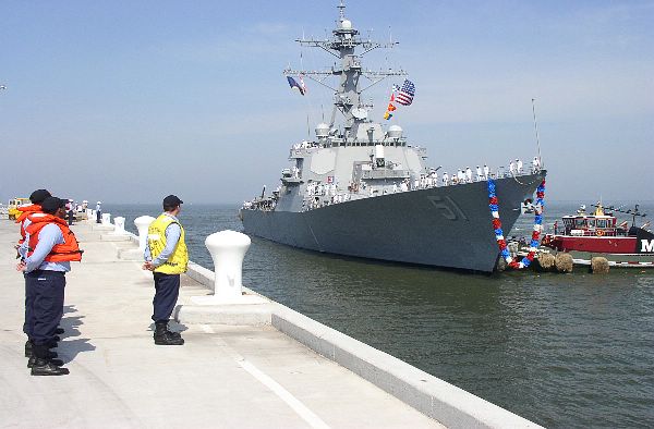 | 46k | 030611-N-0000C-001, Naval Station Norfolk, VA, June 11 2003, the guided missile destroyer USS Arleigh Burke (DDG 51) returns to her homeport of Norfolk, Va., after a five-month deployment in support of Operation Enduring Freedom and Operation Iraqi Freedom. As part of the Theodore Roosevelt Carrier Strike Group, Arleigh Burke fired 26 Tomahawk Cruise Missiles at targets in Iraq. U.S. Navy photo by Master Chief Journalist Kevin Copeland. | Tony Cowart | |