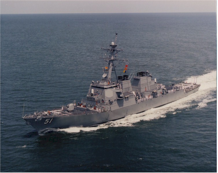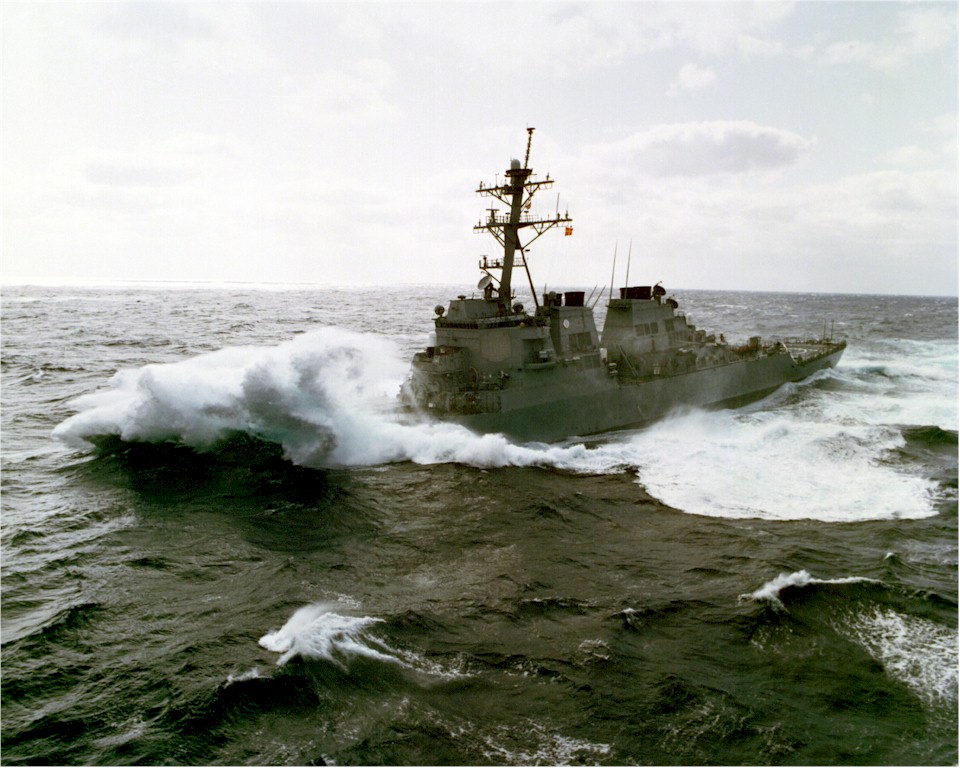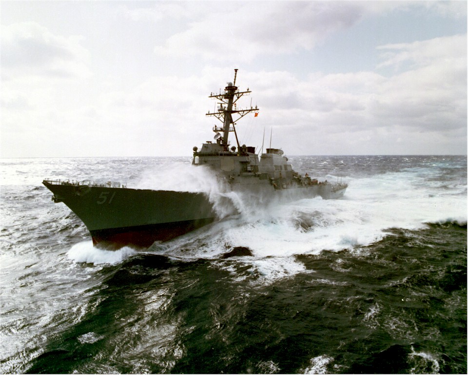 | 172k | DN-SC-93-03710. Atlantic Ocean, 31 March 1993. A port bow view of the guided-missile destroyer USS Arleigh Burke (DDG 51) underway in rough seas. U.S. Navy photo by PH3 James Collins. | Robert M. Cieri | |