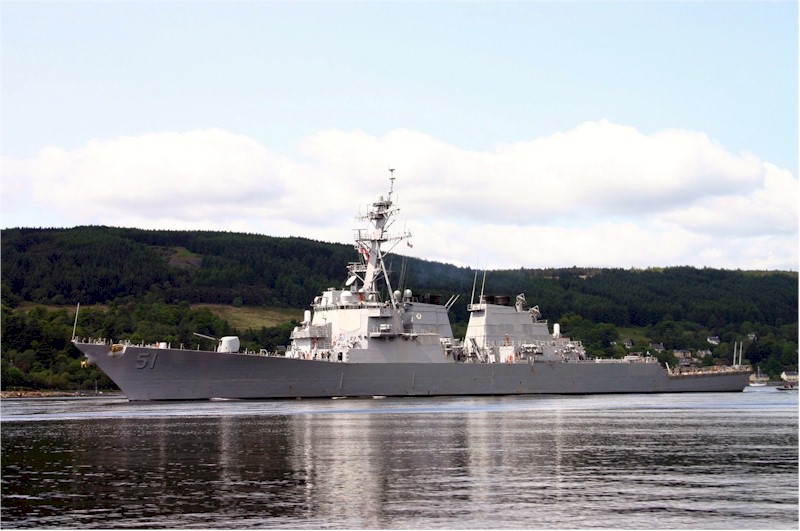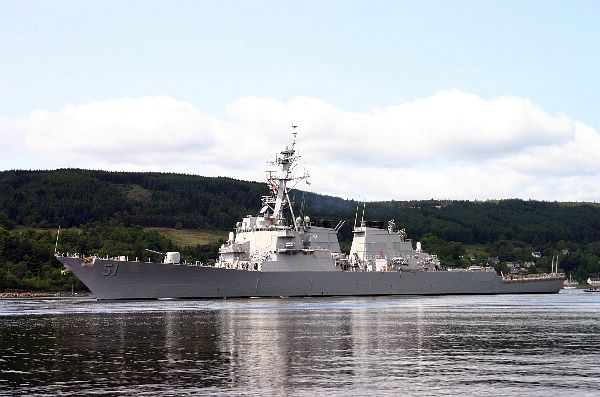 | 50k | 050606-N-0000C-001, Faslane, Scotland, June 6 2005, the guided missile destroyer USS Arleigh Burke (DDG 51) departs Clyde Naval Base in Faslane, Scotland. Arleigh Burke participated in the Joint Maritime Course, a multinational NATO exercise being conducted off the coast of Scotland. U.S. Navy photo by Mr. Dave Cullen. | Tony Cowart | |