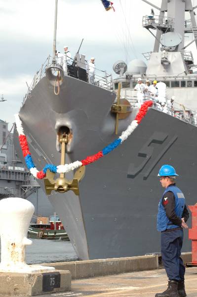 | 34k | 060507-N-4867S-036, Norfolk, VA, May 7 2006, a line handler stands on the pier waiting to help moor the guided-missile destroyer USS Arleigh Burke (DDG 51) after a six-month deployment. Burke deployed in support of the global war on terrorism, where they conducted Maritime Security Operations (MSO) for U.S. 5th Fleet and Theater Security Cooperation for U.S. 6th Fleet. U.S. Navy photo by Photographer's Mate 2nd Class Ola K. Sanders. | Tony Cowart | |
