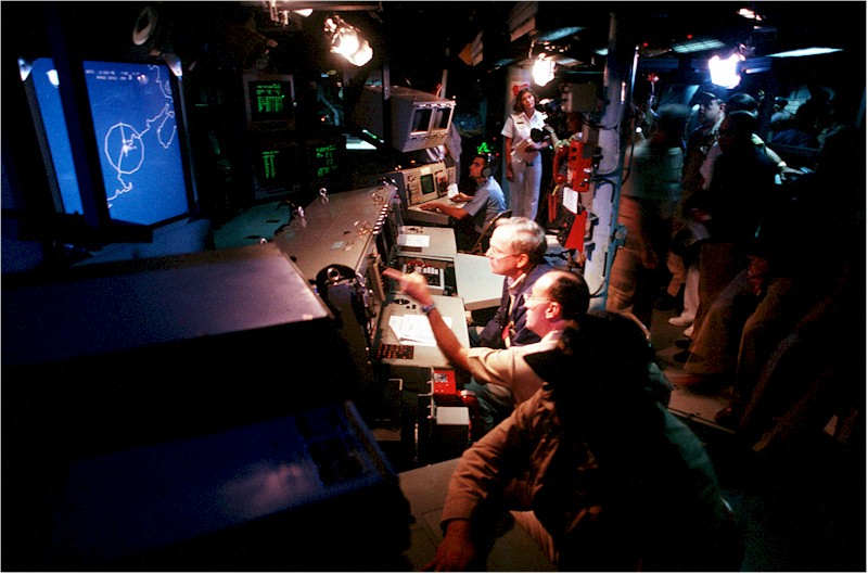 | 107k | DN-ST-91-00800. Secretary of the Navy H. Lawrence Garrett III is briefed in the combat information center of the guided missile destroyer Arleigh Burke (DDG 51) as the ship travels down river for sea trials off the coast of Maine. Photo by PH3 Jerry Ireland, 12 September 1990. | Bill Gonyo | |