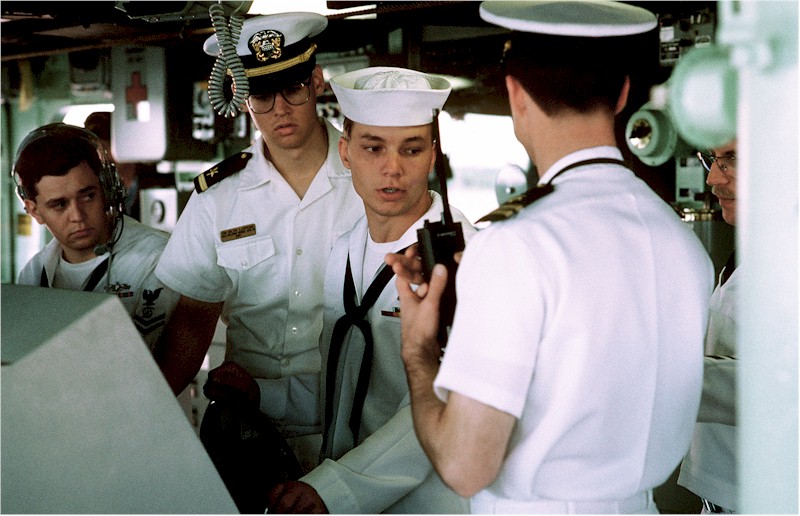 | 109k | DN-ST-92-03936. The helmsman confirms a course change on the bridge of the guided missile destroyer USS Arleigh Burke (DDG 51). Photo by James Giusti, 01 January 1991. | Bill Gonyo | |