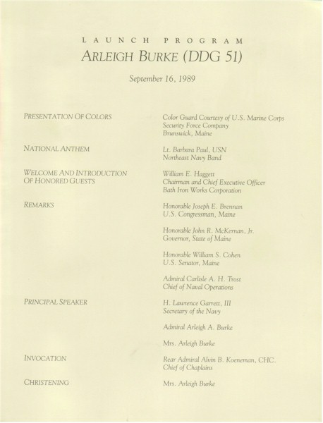 | 53k 40k | The launching program for the USS Arleigh Burke (DDG 51), the event was held at Bath Iron Works, Bath ME, 16 September 1989, along with Schedule of Events for the Launching. | Robert M. Cieri | |
