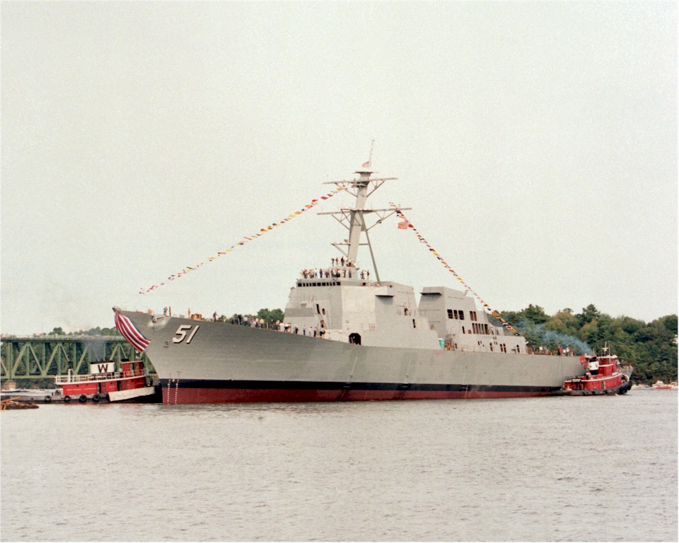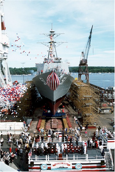 | 100k | The guided missile destroyer Arleigh Burke (DDG 51) slides down the ways following its christening at the Bath Iron Works shipyard. Photo by PH2 James Saylor. | Bill Gonyo | |
