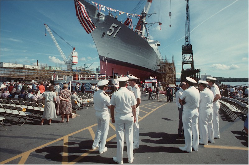 | 131k | The bow of the Aegis guided missile destroyer USS Arleigh Burke (DDG 51) looms over the guests and naval personnel gathered for the ship's launch ceremony. Photo by PH3 Thomas Witham. | Bill Gonyo | |