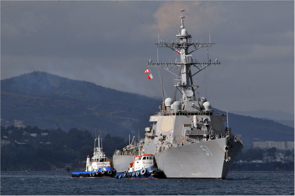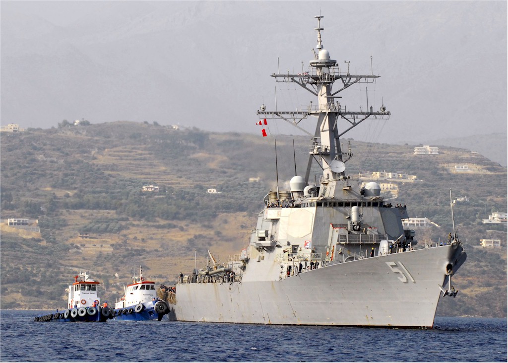 | 182k | 070727-N-0780F-002. Souda Bay, Crete, July 27 2007, the guided-missile destroyer USS Arleigh Burke (DDG 51) is met by Greek tugs as it arrives in Souda Harbor for a routine port call. U.S. Navy photo by Paul Farley. | Robert M. Cieri | |