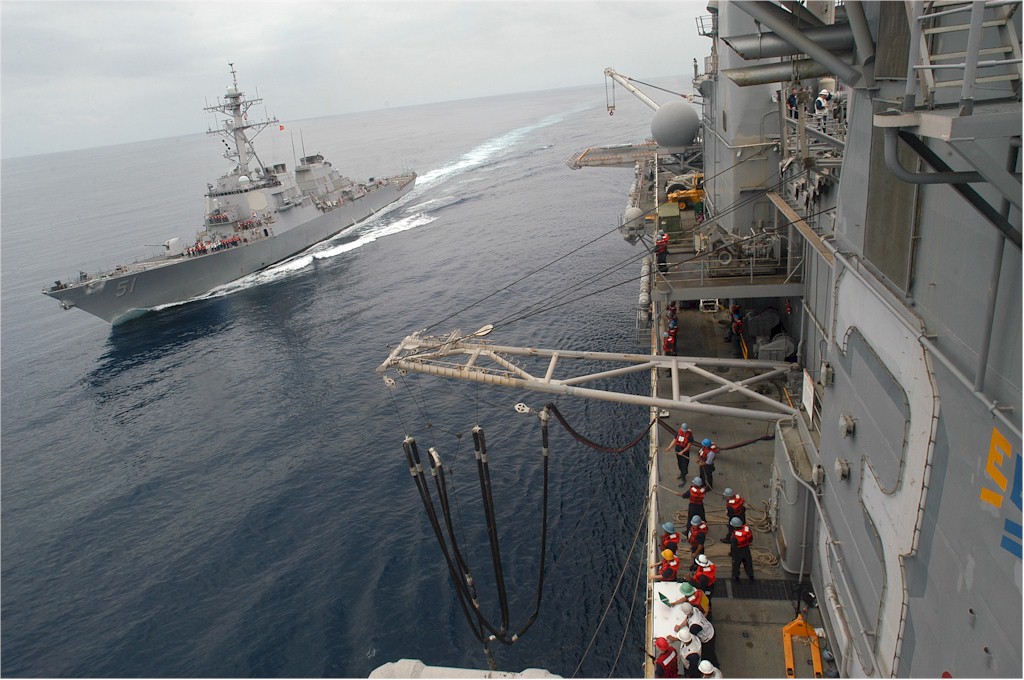 | 136k | 131126-N-AP176-054. Atlantic Ocean, November 26 2013, sailors aboard the guided-missile destroyer USS Arleigh Burke (DDG 51) look on during a replenishment-at-sea (RAS) with the Military Sealift Command Fleet replenishment oiler USNS Patuxent (T-AO 201). Arleigh Burke is conducting its final pre-deployment evaluation with the George H.W. Bush Strike Group to achieve mission readiness and the ability to work alongside international allies in the execution of the Navy's maritime strategy. U.S. Navy photo by Mass Communication Specialist 2nd Class Jeff Atherton. | Robert M. Cieri | |