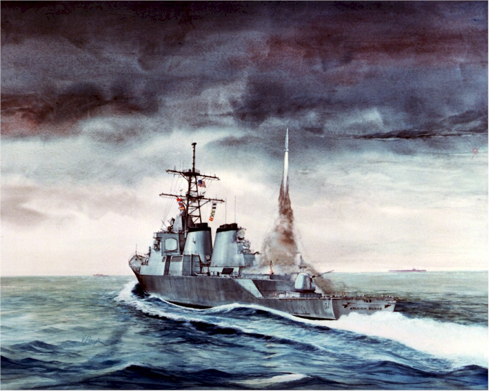 | 175k | DN-SC-86-04710. 01 March 1986, an artist's concept of the USS Arleigh Burke (DDG 51) class guided missile destroyer, shown firing a Standard-ER (SM-2) missile from the stern vertical launch system (VLS). Note that in this concept rendering she is shown with a stern Mark 45 five-inch/54 caliber Dual-Purpose (DP) gun mount. This class was completed with one one gun forward. | Robert M. Cieri | |