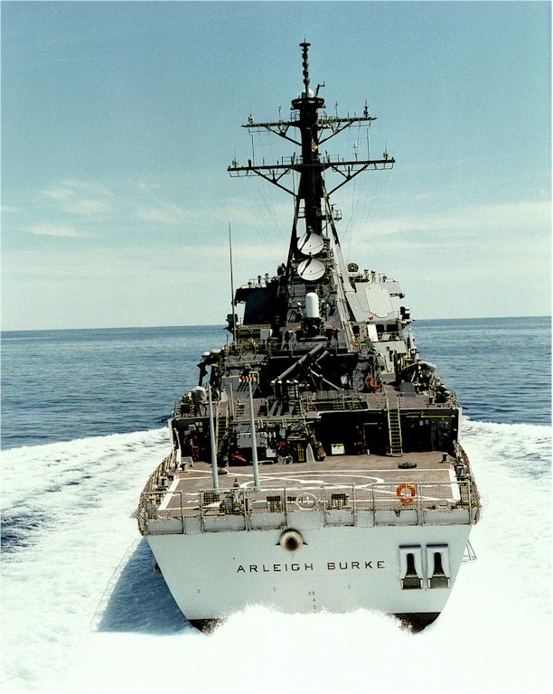 | 137k | DN-SC-91-10728. Atlantic Ocean, 22 June 1991, a stern view of the guided-missile destroyer Arleigh Burke (DDG 51) underway off the coast of New England, on builder's sea trials, prior to her commissioning. Bath Iron Works photo. | Robert M. Cieri | |