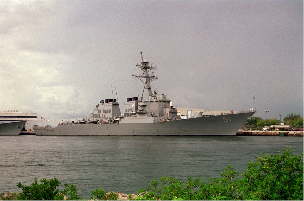 | 175k | DN-SC-94-00531. Port Everglades, 14 October 1993. A starboard beam view of the guided-missile destroyer USS Arleigh Burke (DDG 51) moored at a pier at Port Everglades, Florida. U.S. Navy photo by OS2 John Bouvia. | Robert M. Cieri | |