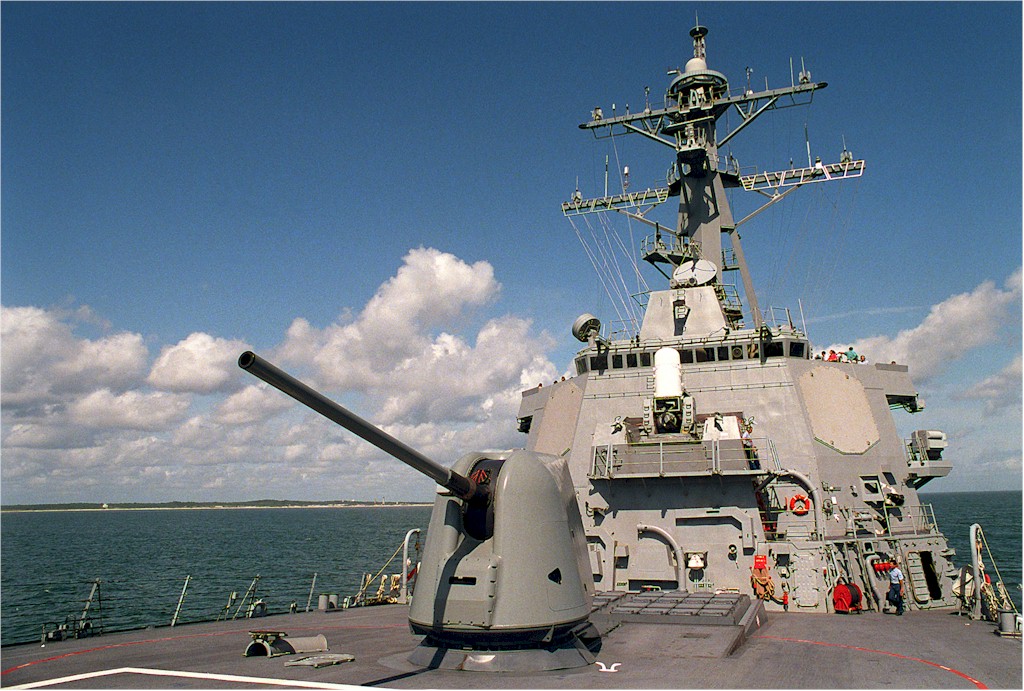 | 188k | 131202-N-AP176-059. Atlantic Ocean, December 2 2013, a round is fired from the MK45 5-inch lightweight gun during a live-fire exercise aboard the guided-missile destroyer USS Arleigh Burke (DDG 51). Arleigh Burke is conducting its final pre-deployment evaluation with the George H.W. Bush Carrier Strike Group to achieve mission readiness and the ability to work alongside international allies in the execution of the Navy's maritime strategy. U.S. Navy photo by Mass Communication Specialist 2nd Class Jeff Atherton. | Robert M. Cieri | |