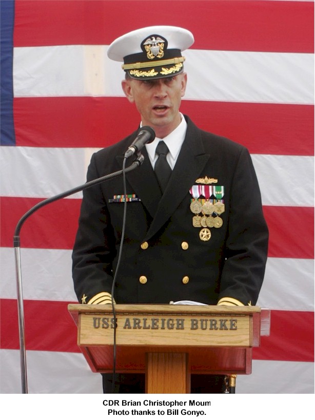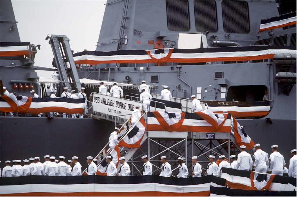 | 216k | 910704-N-ZT118-723. Naval Station Norfolk, 04 July 1991. The Crew has boarded guided-missile destroyer USS Arleigh Burke (DDG 51) as the vessel comes alive following her commissioning ceremony. US Navy photo by Journalist 3rd Class Monica Miles. | Robert M. Cieri | |