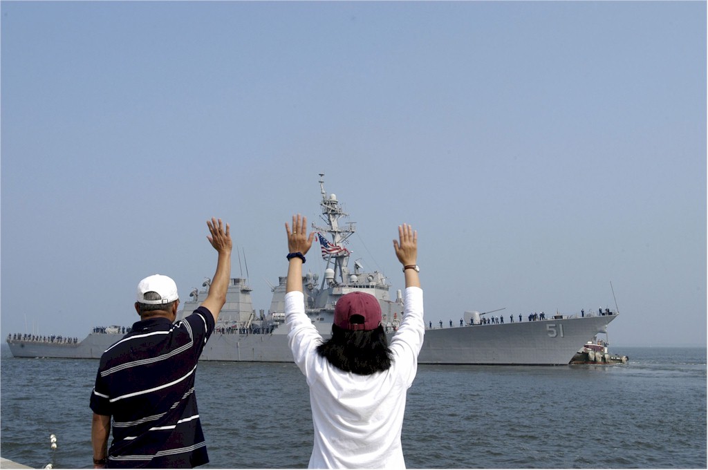 | 106k | 070709-N-9640H-053. Norfolk, Va., July 9 2007, family members wave goodbye to Sailors aboard guided-missile destroyer USS Arleigh Burke (DDG 51) as she gets underway. USS Arleigh Burke deployed as part of Enterprise Carrier Strike Group. Aircraft carrier USS Enterprise (CVN 65) departed Naval Station Norfolk, July 7. U.S. Navy photo by Mass Communication Specialist 2nd Class Gabriela Hurtado. | Robert M. Cieri | |