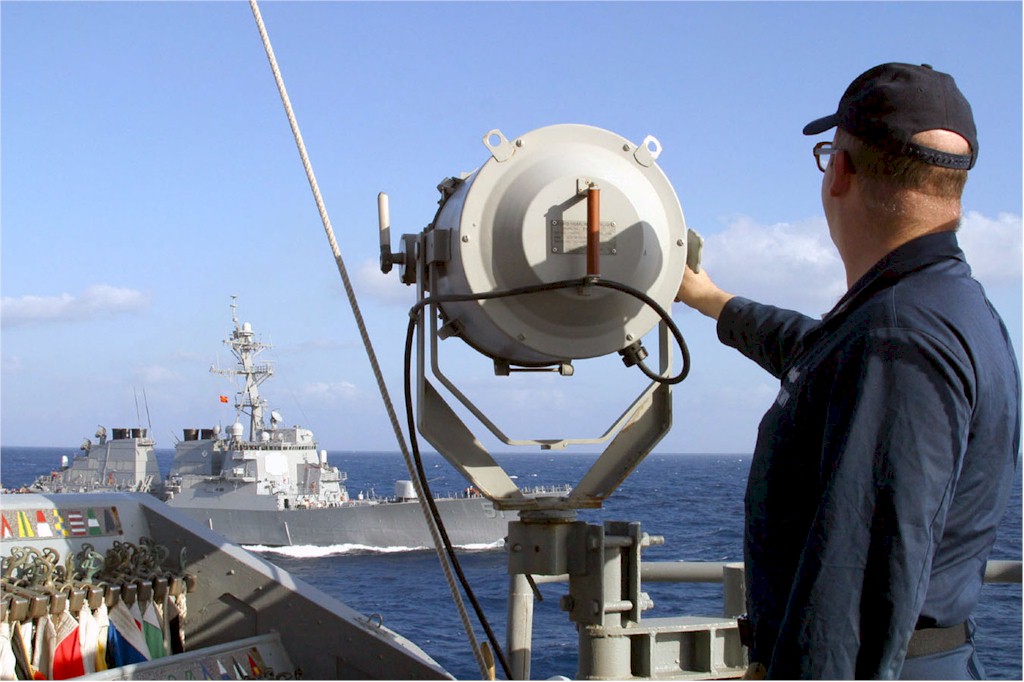 | 146k | 030313-N-0115R-054. The Mediterranean Sea, March 13 2003, Signalman 1st Class Christopher Holcombe from Chesapeake, Va. uses a signal light to communicate with the guided missile destroyer USS Arleigh Burke (DDG 51) from the signal bridge of the guided missile destroyer USS Deyo (DD 989). Deyo is currently deployed to the Mediterranean Sea conducting missions in support of Operation Enduring Freedom. U.S. Navy photo by Journalist 2nd Class Patrick Reilly. | Bill Gonyo | |