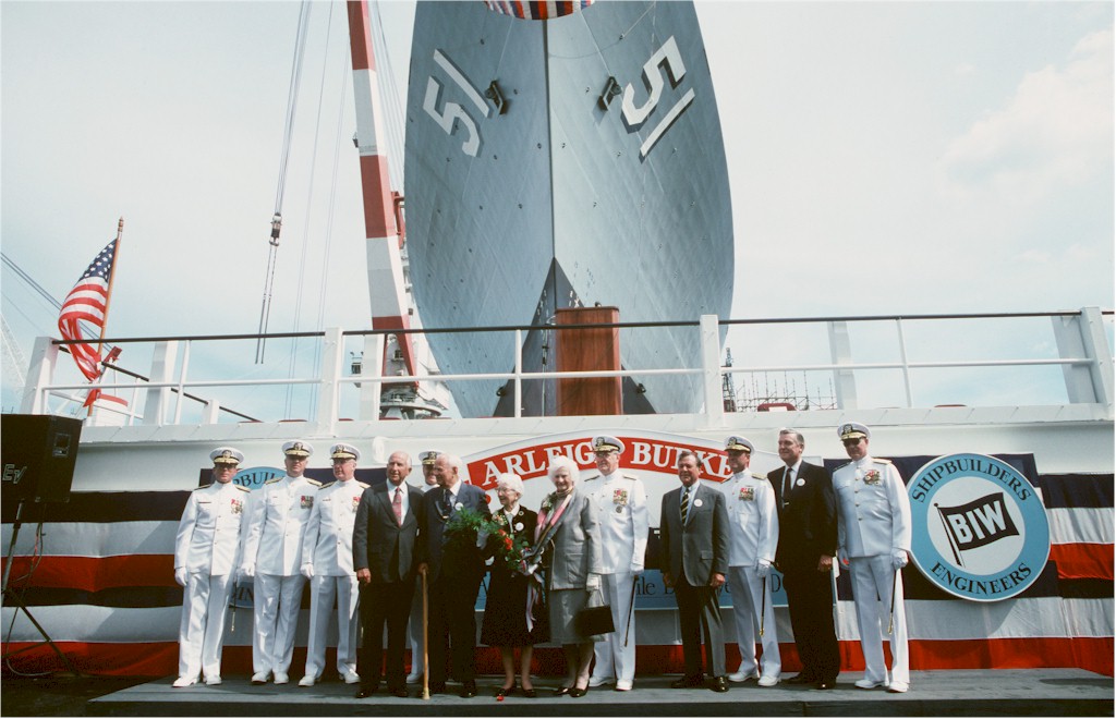 | 153k | Attending the christening and launch of the guided missile destroyer Arleigh Burke (DDG 51), from left to right are RADM (lower half) George N. Gee, RADM Alvin B. Koeneman, VADM John W. Nyquist, retired ADM Thomas H. Moorer, ADM David E. Jeremiah, retired ADM Arleigh Burke, Roberta Burke, Mrs. Milton Miles, ADM Carlisle A.H. Trost, retired ADM James D. Watkins, RADM James B. Greene Jr., retired ADM James L. Holloway III and VADM Peter M. Hekman Jr. | Bill Gonyo | |