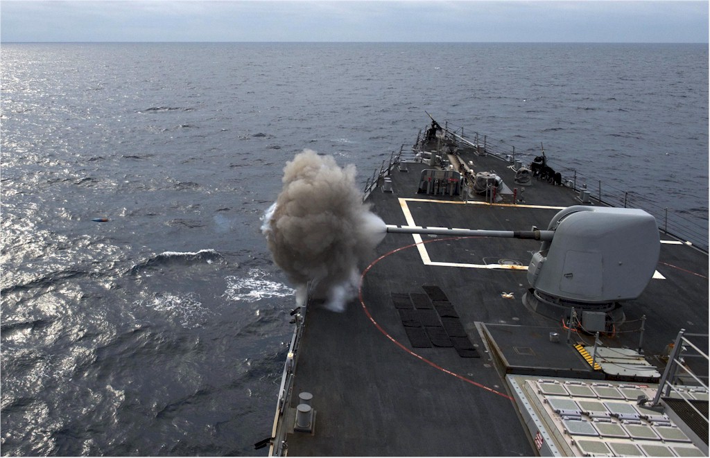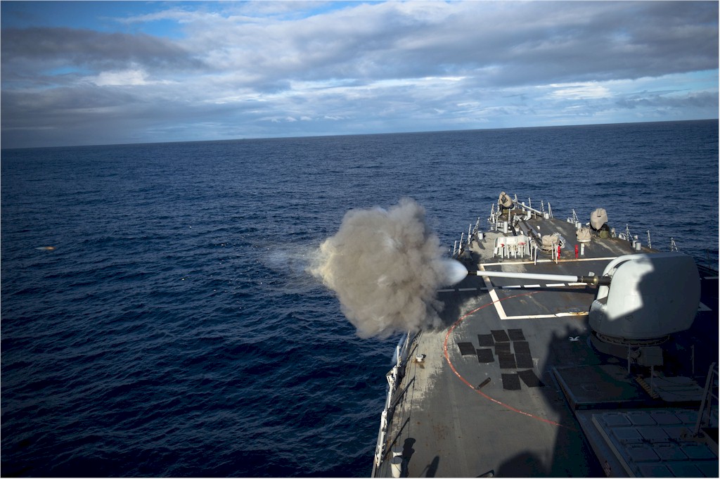 | 176k | 141007-N-WD757-079. Mediterranean Sea, October 7 2014, the guided-missile destroyer USS Arleigh Burke (DDG 51) fires its MK 45 5-inch gun during a live-fire exercise. Arleigh Burke is conducting naval operations in the U.S. 6th Fleet area of responsibility in support of U.S. national security interests in Europe. U.S. Navy photo by Mass Communication Specialist 2nd Class Carlos M. Vazquez II. | Ron Reeves | |