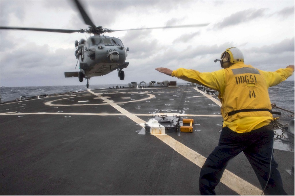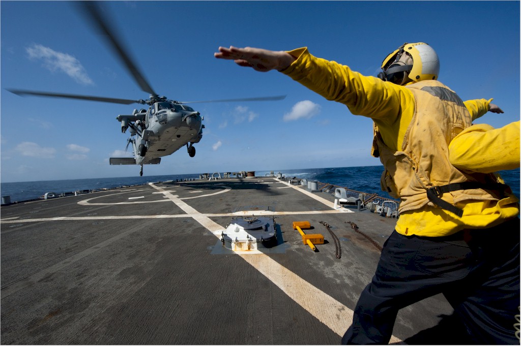 | 160k | 140222-N-WD757-027. Atlantic Ocean, February 22 2014, Boatswain's Mate 2nd Class Darin Kent signals an MH-60R Sea Hawk helicopter to land on the flight deck of the guided-missile destroyer USS Arleigh Burke (DDG 51). Arleigh Burke is on a scheduled deployment in support of maritime security operations and theater security cooperation efforts in the U.S. 5th and 6th Fleet areas of responsibility. U.S. Navy photo by Mass Communication Specialist 2nd Class Carlos M. Vazquez II. | Robert M. Cieri | |