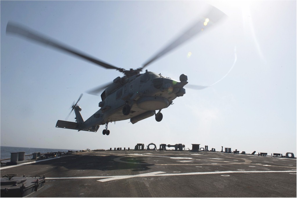 | 94k | 140317-N-WD757-182. Mediterranean Sea, March 17 2014, an MH-60R Sea Hawk helicopter assigned to the Grandmasters of Helicopter Maritime Strike Squadron (HSM) 46 prepares to land on the flight deck of the guided-missile destroyer USS Arleigh Burke (DDG 51). Arleigh Burke is on a scheduled deployment in support of maritime security operations and theater security cooperation efforts in the U.S. 6th Fleet area of responsibility. U.S. Navy photo by Mass Communication Specialist 2nd Class Carlos M. Vazquez II. | Robert M. Cieri | |