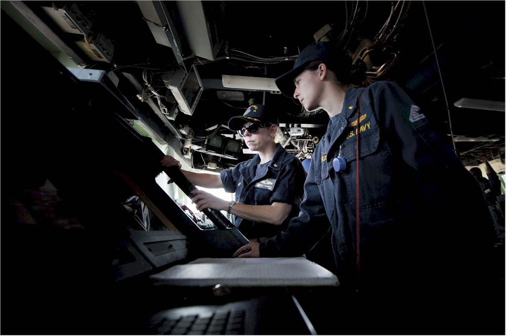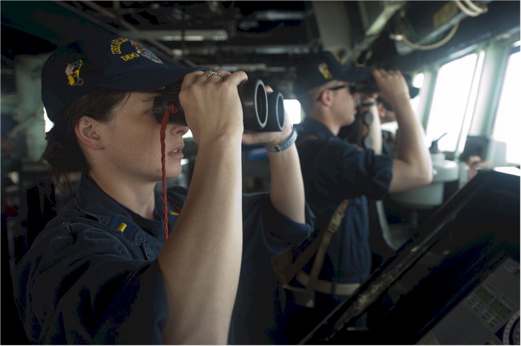 | 112k | 140328-N-WD757-015. Gulf of Oman, March 28 2014, Ensign Casey Strouse, from Kalkaska, Mich., monitors ship traffic on the bridge aboard the guided-missile destroyer USS Arleigh Burke (DDG 51) during a transit through the Strait of Hormuz. Arleigh Burke is deployed in the U.S. 5th Fleet area of responsibility supporting maritime security operations and theater security cooperation efforts. U.S. Navy photo by Mass Communication Specialist 2nd Class Carlos M. Vazquez II. | Robert M. Cieri | |