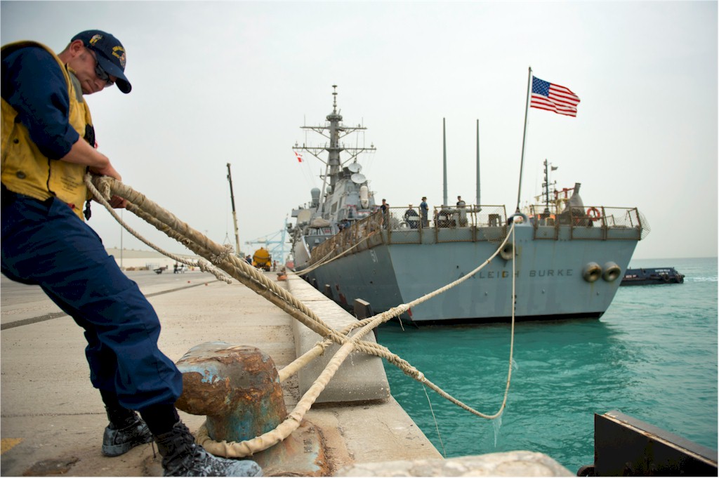 | 143k | 140513-N-WD757-318. Manama, Bahrain, May 13 2014, Boatswain's Mate 2nd Class Travis Wilson, from Rio Vista, Calif., heaves a mooring line as the guided-missile destroyer USS Arleigh Burke (DDG 51) prepares to moor for a port visit in Manama, Bahrain. Arleigh Burke is deployed in the U.S. 5th Fleet area of responsibility supporting maritime security operations and theater security cooperation efforts. U.S. Navy photo by Mass Communication Specialist 2nd Class Carlos M. Vazquez II. | Ron Reeves | |