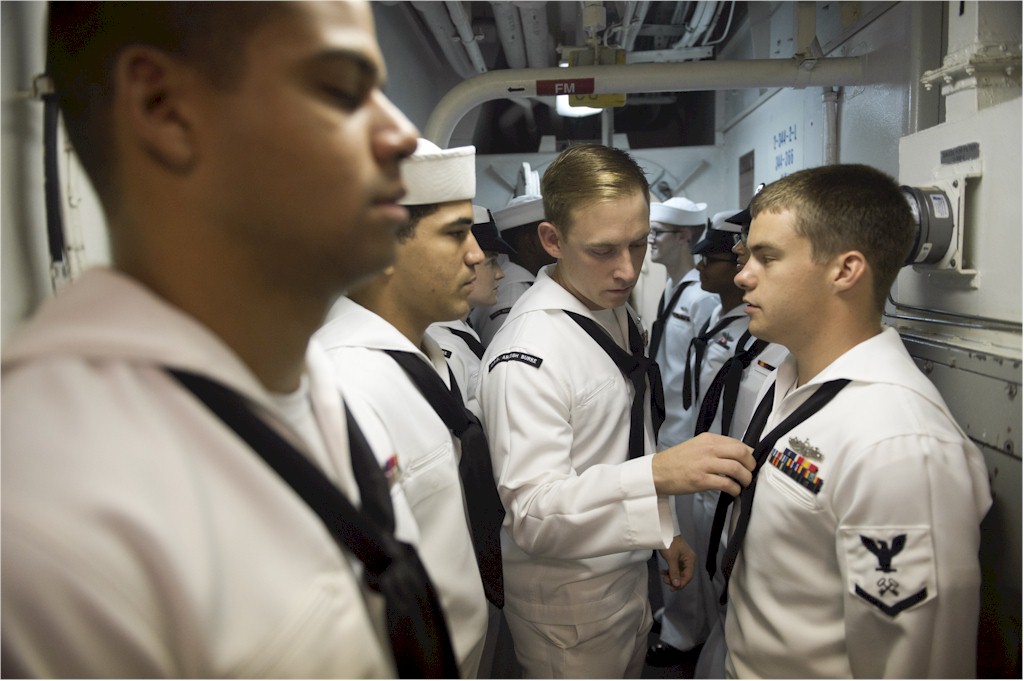 | 134k | 140623-N-WD757-312. Arabian Gulf, June 23 2014, Hospital Corpsman 2nd Class Logan Ortlieb, from Baton Rouge, La., center, fixes his shipmate's neckerchief before they enter a Junior Sailor of the Quarter board aboard the guided-missile destroyer USS Arleigh Burke (DDG 51). Arleigh Burke is deployed in the U.S. 5th Fleet area of responsibility supporting maritime security operations and theater security cooperation efforts. U.S. Navy photo by Mass Communication Specialist 2nd Class Carlos M. Vazquez II. | Ron Reeves | |