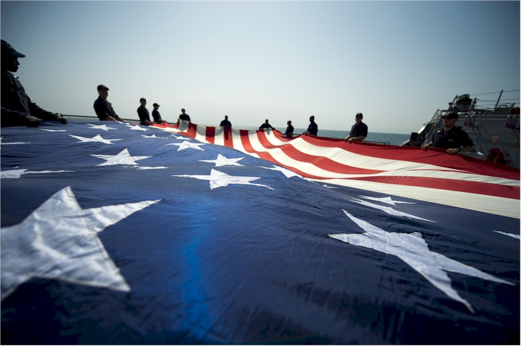 | 119k | 140701-N-WD757-173. Arabian Gulf, July 1 2014, sailors prepare a national ensign on the flight deck of the guided-missile destroyer USS Arleigh Burke (DDG 51). Arleigh Burke is deployed in the U.S. 5th Fleet area of responsibility supporting maritime security operations and theater security cooperation efforts. U.S. Navy photo by Mass Communication Specialist 2nd Class Carlos M. Vazquez II. | Ron Reeves | |