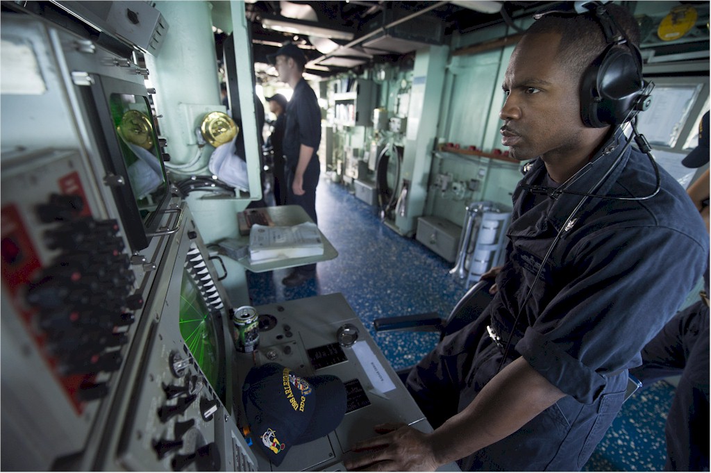 | 173k | 140913-N-WD757-302. Arabian Gulf, September 13 2014, Operations Specialist 2nd Class Joe Bostick, from Raleigh, N.C., monitors maritime traffic on the bridge of the guided-missile destroyer USS Arleigh Burke (DDG 51). Arleigh Burke is deployed in the U.S. 5th Fleet area of responsibility supporting maritime security operations and theater security cooperation efforts. U.S. Navy photo by Mass Communication Specialist 2nd Class Carlos M. Vazquez II. | Ron Reeves | |