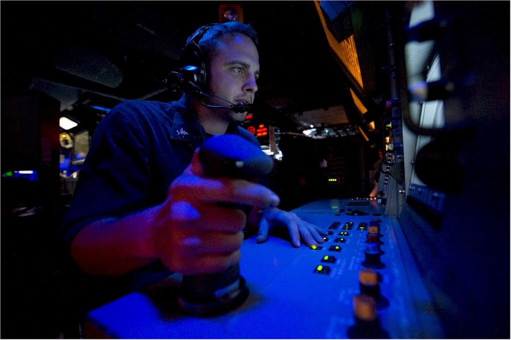| 136k | 140922-N-WD757-006. Red Sea, September 22 2014, Fire Controlman 2nd Class Timothy Bradow, from Norfolk, stands watch in the combat information center aboard the guided-missile destroyer USS Arleigh Burke (DDG 51). Arleigh Burke is deployed in the U.S. 5th Fleet area of responsibility supporting maritime security operations and theater security cooperation efforts. (U.S. Navy photo by Mass Communication Specialist 2nd Class Carlos M. Vazquez II. | Ron Reeves | |