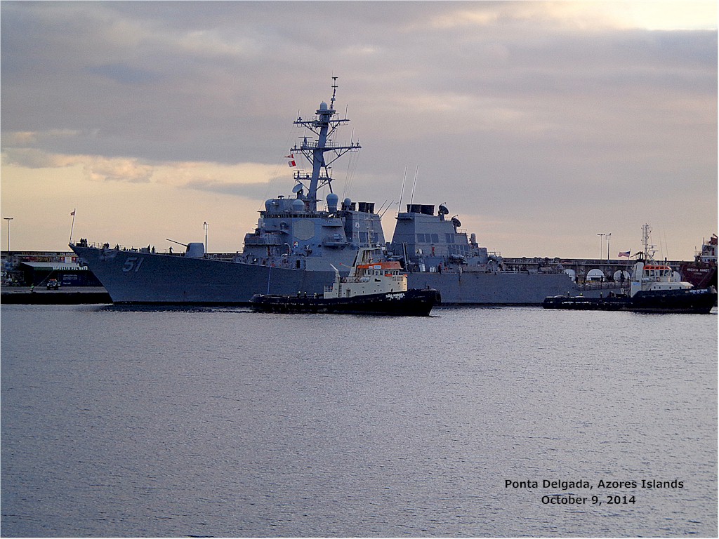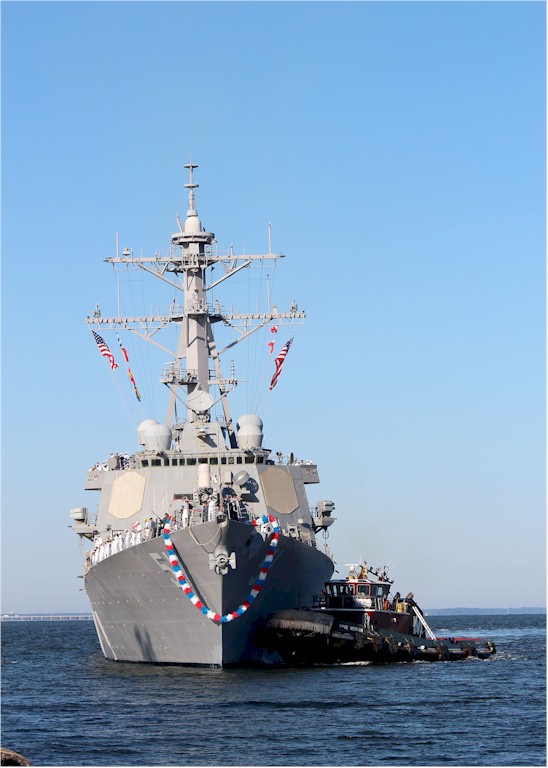 | 130k | 070709-N-9640H-076. Norfolk, Va., July 9 2007, tug boats escort USS Arleigh Burke (DDG 51) as the ship gets underway July 9. USS Arleigh Burke deployed as part of the Enterprise Carrier Strike Group along with the guided missile destroyers USS Stout (DDG 55), USS J.E. Williams (DDG 95) and USS Forrest Sherman (DDG 98). The guided missile cruiser USS Gettysburg (CG 64), homeported in Mayport, Fla., and the nuclear-powered submarine USS Philadelphia (SSN 690), homeported in Groton, Conn., are also part of the strike group. The aircraft carrier USS Enterprise (CVN 65) departed Naval Station Norfolk Saturday, July 7. U.S. photo by Mass Communication Specialist 2nd Class Gabriela Hurtado. | Bill Gonyo | |