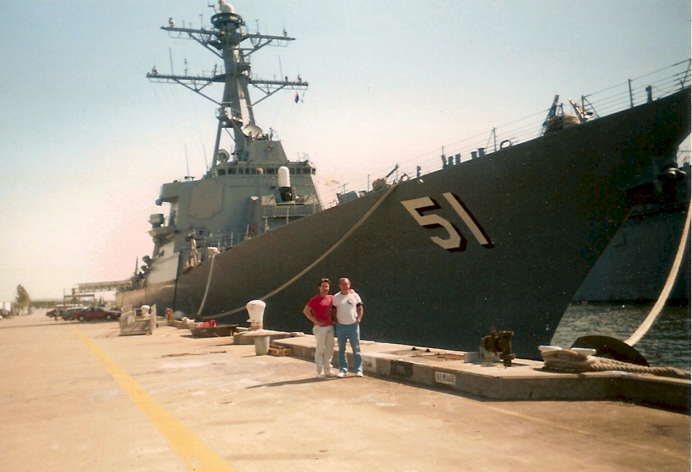 | 151k | USS Arleigh Burke, moored at NOB Norfolk in 1991. In front of the ship is BT1(SW) Scott F. Hiorns and his father, former GM3 Donald Hiorns. | Lynn Hiorns | |