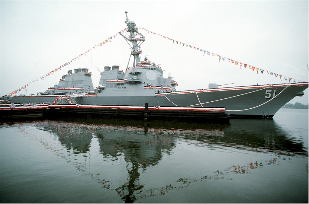 | 154k | DN-ST-92-02340. Norfolk Naval Station, VA, 04 July 1991. Bunting and a rainbow flaghoist adorn the guided-missile destroyer USS Arleigh Burke (DDG 51) on her commissioning day. The Burke is the lead ship of her class, named for the ultimate destroyerman! US Navy photo by PH1 Michael D. P. Flynn. | Robert M. Cieri | |